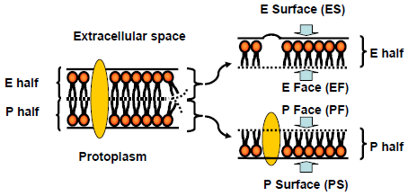 Abbildung 7: Schematische Darstellung des Verlaufs eines Gefrierbruchs und Nomenklatur der Membranbruchflächen. Der Gefrierbruch spaltet die Phospholipiddoppelschicht in zwei Membraninnenansichten, die die Bezeichnung PF (protoplasmic face) und EF (exoplasmic face) tragen. Die Membranoberflächen werden als ES (external surface) und PS (protoplasmic surface) bezeichnet. (Verändert nach Severs und Shotton, 1995). In den Gefrierbruch-Replikas der Membranen tritt vor allem eine granuläre Substruktur hervor. Hierbei handelt es sich um sogenannte intramembranöse Partikel (IMP). Es ist heute allgemein anerkannt, dass sie die in die Lipid- Doppelschicht der Membran inkorporierten Glykoprotein- bzw. Lipoproteinmoleküle repräsentieren. Die Phospholipide stellen sich als glatte, partikelfreie Areale dar. Die meisten oder alle IMP befinden sich auf einer der beiden Bruchflächen, während auf der anderen Bruchfläche in spiegelbildlicher Form Vertiefungen oder Löcher sichtbar werden. Dies hängt wahrscheinlich damit zusammen, dass die IMP an den Lipiden der einen Schicht fester gebunden sind als an denen der anderen Seite. In der Regel befinden sich auf der PF der Membran mehr IMP als auf der EF. Wie bereits beschrieben, wird die Plasmamembran durch den Verlauf des Gefrierbruchs in zwei Hälften gespalten, die nach der Nomenklatur von Branton et al. (1975) mit EF für die dem extrazellulären Raum anliegende Membranbruchfläche und mit PF für die dem Zytoplasma anliegende Membranbruchfläche bezeichnet werden. |