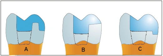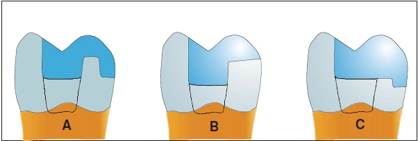 | [Indikationsbereiche adhäsiv befestigter Kera]mikteilkronen im Seitenzahngebiet sind „größere okklusale, approximale und vestibuläre Defekte mit nicht unterstützten Kavitätenwänden im Höckerbereich“ (36;101).