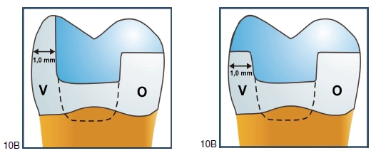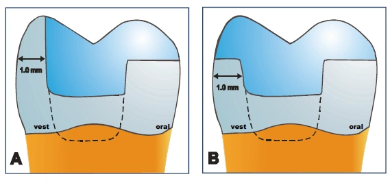 Abbildung 13: Präparation A - vestibuläre Wandstärke: 1,0mm - orale Wandstärke: 2,5 mm mit horizontaler Reduktion Abbildung 14: Präparation B -vestibuläre Wandstärke: 1,0mm mit horizontaler Reduktion -orale Wandstärke: 2,5 mm mit horizontaler Reduktion Die oralen, tragenden Höcker wurden dabei so präpariert, dass sie in Höhe des okklusalen Kavitätenbodens eine Schichtdicke von 2,5 mm aufwiesen. Daraufhin wurden sie in Form einer horizontalen Schrägung auf 1,5 mm eingekürzt, so dass eine Keramikschichtstärke von 1,5 – 2,0 mm möglich war. Die Wandstärke der vestibulären Höcker wurde auf 1,0 mm in beiden Prüfgruppen reduziert. Bei der Präparation B wurde der vestibuläre Höcker um ca. 2,0 mm horizontal eingekürzt, so dass die Keramikstärke über dem ausgedünnten, gekuppelten Höcker ca. 2,0 mm betrug. Diese Wandstärken wurden bei jedem Zahn auf Höhe des okklusalen Kavitätenbodens mit einem Tasterzirkel [M8] an jeweils drei Messstellen (mesial, zentral und distal) sowohl vestibulär als auch oral bestimmt (s. Abbildung 13, 14, 15a, 15c). Die Zähne wurden in folgende Prüfgruppen eingeteilt: Präparation A (s. Abbildung 13; 15a; 15b): - vestibuläre Wandstärke: 1,0 mm - orale Wandstärke: 2,5 mm Präparation B (s. Abbildung 14; 15c; 15d): - vestibuläre Wandstärke: 1,0 mm und horizontale Reduktion um 2,0 mm - orale Wandstärke: 2,5 mm |