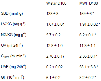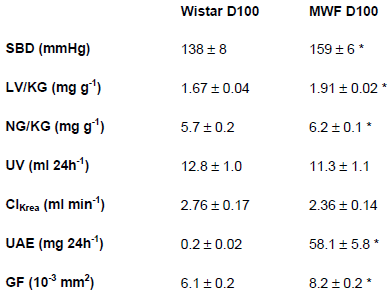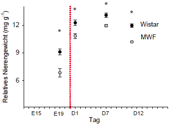 Die relativen Nierengewichte waren an E19, D1, D7 und D12 bei den MWF–Tieren, verglichen mit den Wistar-Tieren, geringer (P < 0.05). (Abb. 6b) Im Gegensatz dazu war das relative Nierengewicht bei den adulten MWF-Tieren an D100, verglichen mit den Wistar-Kontrolltieren, erhöht (P < 0.05) (Tab. 6). Der systolische Blutdruck und das Verhältnis des normalisierten linksventrikuklären Gewichts des linken Ventrikels zum Körpergewicht war bei den MWF-Tieren im Vergleich zu den Wistar-Tieren an D 100 erhöht (P < 0.05) (Tab. 4). Das Urinvolumen und die Kreatininclearance waren bei den MWF-Tieren im Vergleich zu den Wistar-Kontrolltieren an D100 nicht verändert, jedoch zeigte sich an D100 bei den MWF-Tieren im Vergleich eine starke Zunahme der Urinalbuminexkretion (P< 0.05) (Tab. 4). Tabelle 4: Systolischer Blutdruck (SBD), Gewicht des linken Ventrikels bezogen auf das Körpergewicht (LV/KG), Nierengewicht bezogen auf das Körpergewicht (NG/KG), Urinvolumen (UV), Kreatininclearance (ClKrea), Urinalbuminexkretion (UAE) und Glomeruläre Fläche (GF) an Postnataltag 100 (D100) n = 8-16, * p<0.05 gegenüber Wistar. |