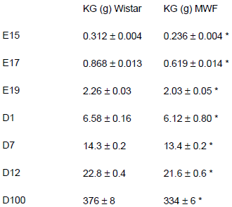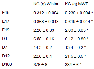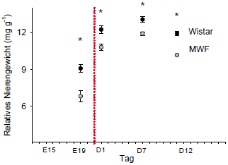 Abb. 6b: Perinatale Nierengewichte bezogen auf das Körpergewicht an Embryonaltag E19 (E19) und an den Postnataltagen 1, 7, und 12 (D1, D7, and D12). Die gepunktete Linie zeigt Embryonaltag E21 an, den Geburtstag, n = 18-54, *p<0.05 vs. Wistar. 4.1.3 Körpergewichte Die Körpergewichte der MWF-Tiere waren im Vergleich zu den Wistar-Kontrolltieren an den Embryonaltagen E15, E 17, E19 und an den postnatalen Tagen D1, D7, D12 und D100 reduziert (P < 0.05) (Tabelle 3). Tabelle 3: Körpergewichte E (Embryonaltag) 15, E17, E19; D (Postnataltag) 1, D7, D12, D100; KG (Körpergewichte) in Gramm (g); * p< 0.05 vs. Wistar - Stamm, n = 15-30. |