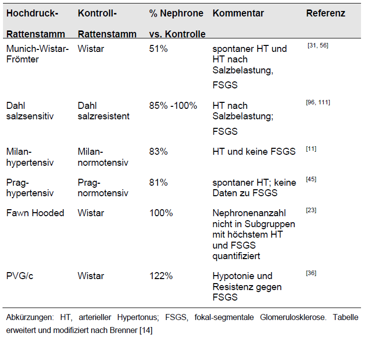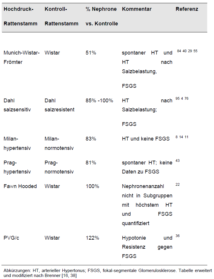 Tabelle 2 : Nephronenanzahl, arterieller Hypertonus und progredientes Nierenversagen in verschieden hypertensiven Rattenstämmen
