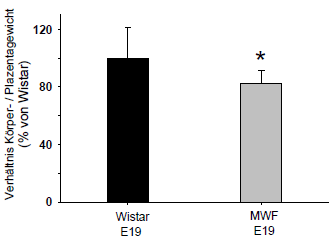 4.1 Plazenta-, Nieren- und Körpergewichte Das Verhältnis des Körpergewichts zum Plazentagewicht war an E19 bei den MWF-Tieren im Vergleich zu den Wistar-Tieren um 18 Prozent niedriger (p<0.05). (Abb. 6A) Die Messung der perinatalen Nierengewichte der MWF-Tiere zeigt zu allen Untersuchungszeitpunkten signifikant erniedrigte Werte (p<0,05) im Vergleich zu den perinatalen Nierengewichten der Wistar-Ratten-Kontrollgruppe. (Abbildung 6B) Abbildungen 6A und 6B: Verhältnis von Körper-/ Plazentagewicht (6A) und relatives Nierengewicht (6B) Abb. 6 A: Verhältnis von Körpergewicht und Plazentagewicht an Embryonaltag E19 (E19) und den Postnataltagen D1, D7 und D12 in Prozent des Gewichtsverhältnisses bei Wistar, n = 18-20, *p<0.05 vs. Wistar. |