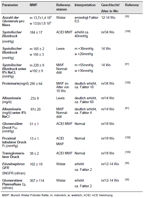 | [Eine Behandlung des spontanen Hypertonus mit dem Dihydropyridin-Calciumantagonisten Nitrendipin blieb] hingegen trotz gleicher Senkung des arteriellen Blutdrucks ohne Einfluss auf die Proteinurie. Im Gegensatz zur Nitrendipinbehandlung war der ACE-Hemmer jedoch in der Lage den normalen glomerulären Druck um ca. 10 mm Hg (50 vs. 40 mm Hg) auf niedrig normale Werte zu senken. Infolgedessen kann postuliert werden, dass bei MWF-Ratten ein funktioneller Defekt an der GBM vorliegt, der bereits in Gegenwart eines normalen glomerulären Druckes zur Proteinurie führt. Die Bedeutung von funktionellen Veränderungen und der Einfluss von geschlechtsspezifischen Faktoren wird durch die Tatsache belegt, dass weibliche MWF-Ratten hinsichtlich der Reduktion der Glomerulazahl und der Glomerulagröße ähnliche Veränderungen aufweisen wie männliche Tiere, obwohl die Entwicklung der Hypertonie und Proteinurie deutlich abgeschwächt und verzögert ist. Auf der Basis der bisher berichteten Untersuchungsergebnisse sind die wesentlichen phänotypischen Befunde der männlichen MWF-Ratte in Tabelle 6 zusammengefaßt.
