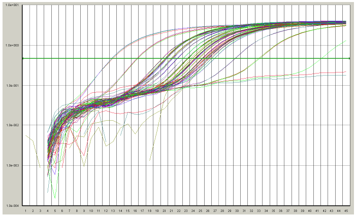 Die PCR-Reaktion ist in ihrer frühen exponentiellen Phase reproduzierbarer als an ihrem Endpunkt. Betrachtet man Amplifikationsplots von Wiederholungen derselben Probe, so erkennt man, dass die Kurven mit zunehmender Zyklenzahl im Bereich ihrer Sättigung immer mehr divergieren, während sie anfänglich praktisch perfekt übereinander liegen. Dies liegt an der exponentiellen Natur der PCR, durch die kleine Schwankungen zu Beginn der Reaktion einen immer größer werdenden Effekt haben können. Je früher eine Auswertung der Amplifikationskurve erfolgt, desto präziser ist daher das Ergebnis. Abbildung 5: Typische Fluoreszenzkurven eines Taqman-PCR-Laufs mit 45 Zyklen. Die horizontale grüne Linie zeigt den Ct-Wert (cycle threshold, Zyklusschwellenwert). Deutlich sichtbar ist der Verlauf der sieben Standardverdünnungen sowie die Leerkontrolle (mit einem Ausreißer) rechts im Bild. |