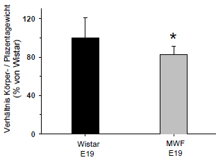 4.1 Plazentagewicht-, relative Nieren- und Körpergewichte 4.1.1 relatives Plazentagewicht Das Verhältnis des Körpergewichts zum Plazentagewicht war an Tag E19 bei den MWF-Tieren im Vergleich zu den Wistar-Tieren um 18 Prozent erniedrigt (p<0.05). (Abb. 6a) Abbildung 6a: Verhältnis von Körper-/ Plazentagewicht Abb. 6a: Verhältnis von Körpergewicht und Plazentagewicht an Embryonaltag E19 (E19) und den Postnataltagen D1, D7 und D12 in Prozent des Gewichtsverhältnisses bei Wistar, n = 18-20, *p<0.05 vs. Wistar. 4.1.2 relative Nierengewichte Die Messung der perinatalen Nierengewichte der MWF-Tiere zeigt zu allen Untersuchungszeitpunkten signifikant erniedrigte Werte (p<0,05) im Vergleich zu den perinatalen relativen Nierengewichten der Wistar-Ratten-Kontrollgruppe (Abbildung 6b). |