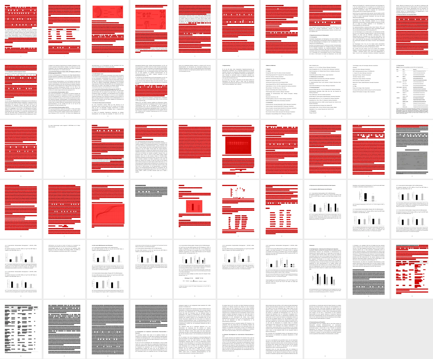 Weiße Seiten wurden entweder noch nicht untersucht oder es wurde nichts gefunden. Blaue Seiten umfassen Titelblatt, Inhaltsverzeichnis, Literaturverzeichnis, Vakatseiten und evtl. Anhänge, die in die Berechnung nicht einbezogen werden.
