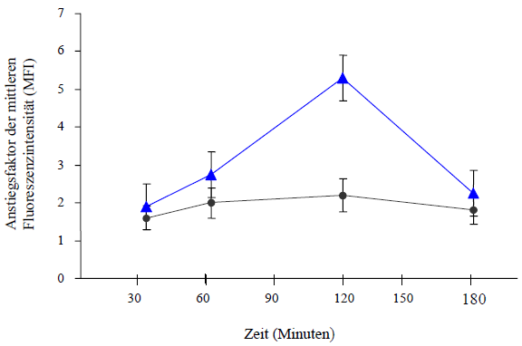 [Seite 92] Unreife Dendritische Zellen verfügen über eine höhere Kapazität über den Mannoserezeptor FITC-konfugiertes Dextran aufzunehmen als reife DCs. Die blaue Linie zeigt über einen Zeitraum von 30 bis 180 Minuten die Fähigkeit unreifer DCs das Makromolekül FITC-Dextran aufzunehmen. Die graue Linie zeigt reife Dendritische Zellen und deren eingeschränkte Aufnahmekapazität gegenüber FITC-Dextran. Abbildung 5: Aufnahme durch FITC-Dextran durch unreife DCs im Vergleich zu reifen DCs |