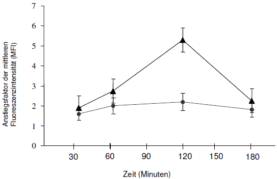| Die gleichen Experimente wurden mit reifen DCs durchgeführt und wie in der Abbildung dargestellt, verlief die Kurve, aufgrund der eingeschränkten Aufnahmekapazität reifer DCs, deutlich flacher als bei den unreifen Zellen und zeigte auch keinen signifikanten Anstieg oder Abstieg der Aufnahmekapazität.