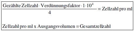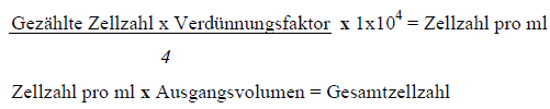 Die Anzahl lebender Zellen wurde durch Anfärben mit Trypanblau bestimmt. Lebende Zellen nehmen dabei den blauen Farbstoff nicht auf, während sich tote Zellen dunkelblau anfärben. Dazu wurden 10 μl der Zellsuspension 1:10 mit Trypanblau verdünnt. Das Gemisch wurde dann mehrmals durch auf und ab pipettieren gut gemischt und dann vorsichtig 10μl der Suspension in die Zählkammer eines Neubauer-Hämatozytometer gefüllt. Mit Hilfe eines inversen Mikroskops wurde die Anzahl der lebenden, ungefärbten Zellen in den vier Zählquadraten, die in 16 Einzelquadraten unterteilt sind, gezählt. Die Zellkonzentration pro ml und die Gesamtzellzahl pro Probe wurde wie folgt ermittelt: Kryokonservierung von Zellen Die Zellen wurden in einem totalen Volumen von 1-2 x107/ml in 1ml Einfriermedium pro Kryoröhrchen eingefroren. Das Einfriermedium (90 % FCS und 10 % DMSO) und die Kryogefäße wurden vor dem Einfrieren auf schmelzendem Eis gekühlt. Die Zellen wurden in 50- oder 15 ml Zentrifugenröhrchen mittels Zentrifugieren pellettiert, der Überstand abgesaugt, das Pellet aufgeschüttelt und ebenfalls auf schmelzendem Eis gekühlt. Anschließend wurde das kalte Einfriermedium vorsichtig zu den Zelllen [sic] gegeben, wobei durch leichtes Schütteln des Röhrchens die Zellen möglichst gleichmäßig mit dem Einfriermedium durchmischt wurden. Aus dieser Zellsuspension, die auch weiterhin auf Eis gekühlt blieb, wurden jeweils 1ml in die zuvor ebenfalls gekühlten und beschrifteten Kryoröhrchen gefüllt. Diese wurden dann sofort in eine Spezial-Einfrierbox überführt, bei –80 °C für 24 Stunden gelagert und anschließend zur Langzeitkryokonservierung in Behälter mit flüssigen Stickstoff transferiert. [Seite 63] Auftauen von Zellen Zum Auftauen von Zellen wurden 6 ml 37 °C warmes RPMI-1640 + 20 % FCS als Auftaumedium verwendet und in 15 ml-Zentrifugenröhrchen vorgelegt. |