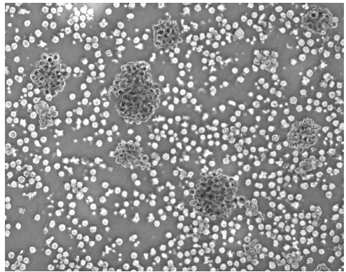 Abbildung 11. Unreife DCs in einer Kulturplatte: Die Zellen aggregieren und bilden sich zu kleineren und größeren Clustern zusammen. Leukozyten wurden aus dem frischen peripheren Blut oder aus „buffy coats“ isoliert und nach der zweistündigen Adhärenzphase in serumfreien Medium, das mit 500U/ml IL-4, 800 U/ml GM-CSF supplementiert war kultiviert. |