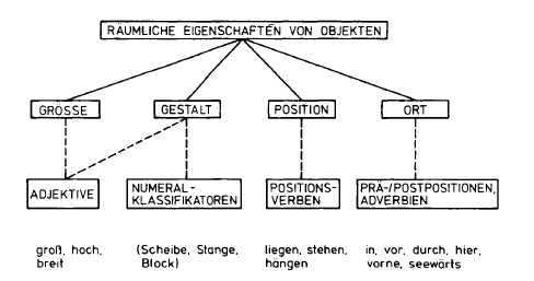 Abb. 2.11: Raumrefentielle Bezeichnungen im Deutschen [...] Diese drücken Gestalteigenschaften aus, indem sie die physische Ausdehnung eines Objekts auf eine Dimension projizieren. [Hier und im Folgenden beziehe ich mich vor allem auf Lang (1989, 1987a, 1987b), Bierwisch (1967) und Wunderlich (1982, 1985, 1986).] Bierwisch, Manfred (1967): Some semantic universals of German adjectivals. Foundations of Language 3.1: 1-37. (Dt. Über.: Einige semantische Universalien in deutschen Adjektiven. In: H. Steger (1970): Vorschläge für eine strukturale Grammatik des Deutschen. Darmstadt: Wissensch. Buchgeselschaft, 269-318). Lang, Ewald (1987): Gestalt und Lage räumlicher Objekte: Semantische Struktur und kontextuelle Interpretation von Dimensionsadjektiven. In: Bayer, Josef (Hrsg.): Grammatik und Kognition. Psycholinguistische Untersuchungen. Linguistische Berichte, Sonderheft 1, 163-218. Lang, Ewald (1987): Semantik der Dimensionsauszeichnung räumlicher Adjektive. In: Bierwisch, Manfred; Lang, Ewald (Hrsg.): Grammatische und konzeptuelle Aspekte von Dimensionsadjektiven, Berlin: Akademie-Verlag (studia grammatica XXVI + XXVII), 287-459. Lang, Ewald (1989): Primärer Orientierungsraum und inhärentes Proportionsschema: interagierende Kategorisierungsraster bei der Konzeptualisierung räumlicher Objekte. In: Habel, Christoph [sic]; Herweg, Michael; Rehkämper, Klaus (Hrsg.): Raumkonzepte in Verstehensprozessen. Interdisziplinäre Beiträge zu Sprache und Raum. Tübingen: Niemeyer, 150-174. Wunderlich, Dieter (1982a): Sprache und Raum I. In: Studium Linguistik 12, 1-19. Wunderlich, Dieter (1982b): Sprache und Raum II. In: Studium Linguistik 13, 37-59. Wunderlich, Dieter (1985): Raum, Zeit und das Lexikon. In: Schweizer, Harro (Hrsg.): Sprache und Raum: psychologische und linguistische Aspekte der Aneignung und Verarbeitung von Räumlichkeit. Stuttgart: Metzler, 66-89. Wunderlich, Dieter (1985): Raumkonzepte - Zur Semantik der lokalen Präpositionen. In: Ballmer, Thomas T.; Posner, Roland (Hrsg.): Nach-Chomskysche Linguistik. Neue Arbeiten von Berliner Linguisten. Berlin: de Gryter, 340-361. Wunderlich, Dieter (1986): Raum und die Struktur des Lexikons. In: Bosshardt, Hans-Georg (Hrsg.): Perspektiven auf Sprache. Interdisziplinäre Beiträge zum Gedenken an Hans Hörmann. Berlin, New York: de Gruyter, 212-231. |