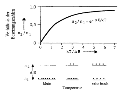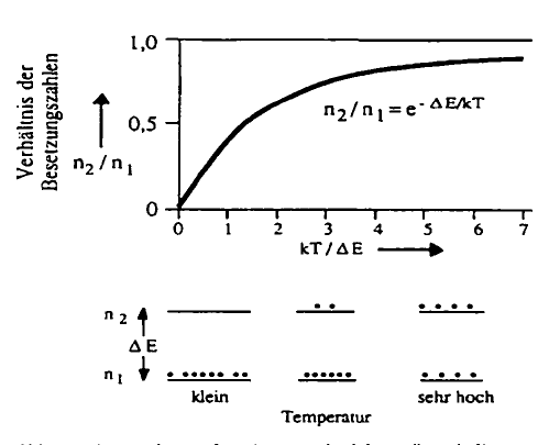 Ein Laser ist ein Gerät zur Umwandlung von elektrischer Energie in "geordnete" Lichtenergie. Die von Einstein postulierte induzierte Emission ist zwar als Effekt in jeder Leuchterscheinung von Materie rudimentär vorhanden, kann aber nur in ausgewählten Medien wirklich zur Dominanz gebracht werden. Spontane Emission von Licht bedeutet, dass einem Körper (Gas, Flüssigkeit oder Festkörper) Energie zugeführt wurde, so dass die "Leuchtelektronen" aus dem Grundzustand n1 in einen angeregten Zustand (Niveau) n2 gebracht wurden und das Elektron nach einer charakteristischen Zeit wieder spontan in den Grundzustand übergeht und ein Photon aussendet. Die Verteilung der Elektronen auf den Grundzustand und die angeregten Zustände (Besetzungszahl) hängen von der Temperatur ab (Abb. 1), je höher die Temperatur, desto mehr Elektronen befinden sich im Mittel in angeregten Zuständen. Bei einer thermischen Lichtquelle (Glühbirne) wird ständig Energie durch Erwärmen zugeführt, um Elektronen wieder in höhere Niveaus zu "pumpen". Die Verweildauer in den angeregten Niveaus ist kurz; damit das Elektron wieder in den Grundzustand übergehen kann, darf dieser nicht komplett gefüllt sein. Eine Anregung eines Elektrons kann auch durch Einstrahlung von Licht erfolgen, durch Absorption der entsprechenden Energiedifferenz E [sic!] wird das höhere Niveau besiedelt. Neben einem direkten Übergang von einem höheren Niveau direkt zum Grundniveau kann dies auch in Stufen über andere Niveaus erfolgen. Da die Lebensdauer der Niveaus unterschiedlich ist, d.h. die Niveaus unterschiedlich schnell entleert werden, können sich Elektronen in höheren Niveaus "ansammeln". In diesem Fall spricht man von Besetzungsinversion. Abb. 1: Niveau-Schema für ein „Leuchtelektron“ und die Besetzungszahl für verschiedene Temperaturen [Dörschel 1989a]. |
