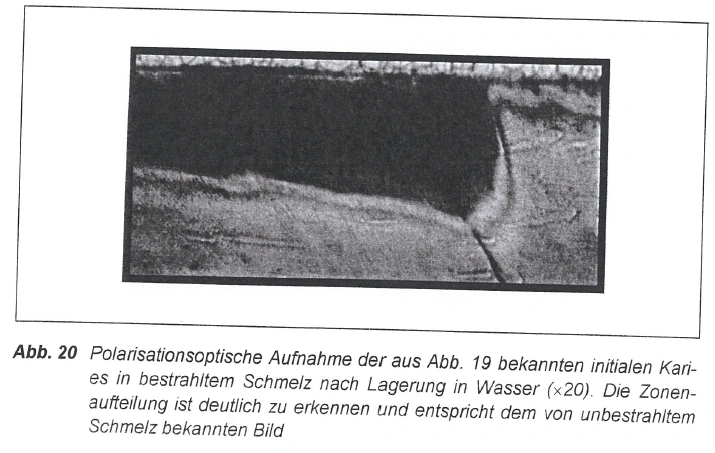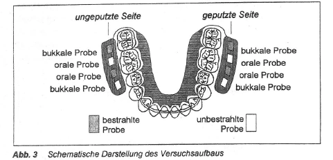 | Aus den oralen und bukkalen Flächen von 48 durchgebrochenen, frisch extrahierten Weisheitszähnen wurde je eine Schmelzprobe entnommen, in Kunststoff eingebettet und poliert. Je eine Probe eines jeden Zahnes wurde mit 60 Gy bestrahlt. Die übrigen Schmelzproben wurden nicht bestrahlt. Zwei bestrahlte und zwei unbestrahlte Proben wurden, teilweise mit Kunststoff abgedeckt (Kontrolle), in die bukkalen Flügel von intraoralen Platten eingelassen, die von 12 Probanden für den Zeitraum von sechs Wochen ganztags getragen wurden. Während dieses Zeitraumes wurde eine Seite der Platte zweimal täglich mit einer fluoridfreien Zahnpaste geputzt. Die andere Seite wurde nicht gesäubert. Die häusliche Mundhygiene erfolgte ebenfalls fluoridfrei. Während der Mahlzeiten wurden die Schmelzproben in 10%ige Saccharose-Lösung eingelegt. Zu Versuchsende wurden die Proben senkrecht zur Oberfläche geschnitten und poliert. Im Kontrollbereich und im der Mundhöhle ausgesetzten Bereich erfolgte die Bestimmung der Mikrohärte (Knoop, 30 N) parallel zur Oberfläche in drei Ebenen (25, 50, 75 µm). Danach erfolgte die histologische Untersuchung, wobei mit planparallelen Schliffen von 90 µm Dicke die verschiedenen Zonen der initialen Schmelzkaries polarisationsmikroskopisch dargestellt wurden. Der Mineralverlust sowie die Läsionstiefen wurden mikroradiographisch bestimmt. Mit Hilfe der Konfokalen Laser-Scanning-Mikroskopie und der Rasterelektronenmikroskopie wurden die mikromorphologischen Charakteristika der initialen Karies in bestrahltem Schmelz erfaßt.