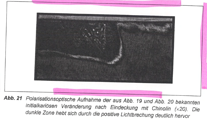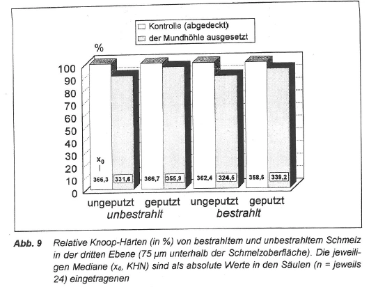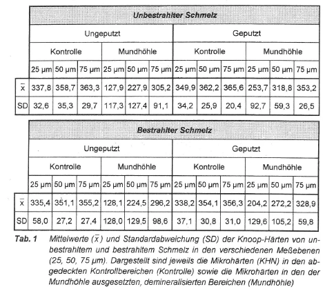 | Das in der vorgestellten Untersuchung beobachtete Schmelzhärteprofil bestätigt die Ergebnisse früherer Studien zum Demineralisationsverhalten von Schmelz [HELLWIG et al., 1993]. Im Bereich der ersten Ebene (25 µm) wurden jeweils die niedrigsten Mikrohärtewerte beobachtet. Dies hängt damit zusammen, daß diese Messung unterhalb der erwartungsgemäß stärker mineralisierten intakten Oberflächenschicht durchgeführt wurde, die etwa 10-20 µm dick ist und deren Mikrohärte damit nicht bestimmt worden ist. Die in der zweiten (50 µm) und dritten (75 µm) Ebene beobachtete kontinuierliche Zunahme der Mikrohärte läßt Rückschlüsse auf das Maß der Demineralisation und die unterschiedlichen Läsionstiefen zu, die mit den verschiedenartigen Hygienemaßnahmen erklärt werden können. | Das beobachtete Schmelzhärteprofil bestätigt die Ergebnisse früherer Studien zum Demineralisationsverhalten von Schmelz (HELLWIG et al., 1993).