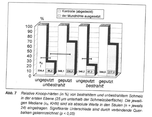 Die Mikrohärten sämtlicher Kontrollbereiche waren nicht signifikant unterschiedlich (p > 0,05). Bei den unbestrahlten Proben unterschieden sich die Mikrohärtewerte des ungeputzten (25,0% des Kontrollwertes) und des geputzten Bereichs (66,1%) in der ersten Ebene signifikant (p < 0,05). Diese Werte unterschieden sich nicht von den bei den bestrahlten Proben im ungeputzten (19,8%) bzw. geputzten Bereich (63,1%) gefundenen Mikrohärtewerten (p > 0,05). Auch in den beiden anderen Ebenen konnten keine signifikanten Unterschiede zwischen den bestrahlten und den unbestrahlten Proben festgestellt werden. |