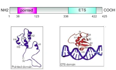 The sheer number of ETV6 fusions in AML allows for the study of a diverse group of leukemias in which more than one of the aforementioned mechanisms might be operating. The t(6;12) translocation is one of several that involve ETV6, in this case ETV6 is fused to STL gene in a B-cell ALL cell line. 4.3. ETV6 ETV6 is a member of the ets (E-26 transforming specific) family of transcription factors. All ets family proteins share a highly conserved protein domain of about 88 amino acids in length the so-called ets domain. The ets domain is a sequence specific DNA binding domain but is [sic] also mediates protein-protein interaction (Figure 4.7, modified from Slupsky, 1998), it is [page 21] evolutionarily highly conserved and found in invertebrates such as Drosophila and C. elegans (Oikawa, 2003; Wasylyk, 1993). The other evolutionarily conserved domain in the 652 amino acids of ETV6 is the N-terminally located pointed or sterile alpha motif (SAM) domain (Figure 4.7). This domain is also called HLH domain and is even more highly conserved in evolution and found in many ets family member. It is found in yeast proteins and has been shown to be involved in homo and heterodimerization in transcription factors and in signal transducing proteins (e.g. of the MAPK pathway) (Grimshaw, 2004). ETV6 contains two alternative translational start codons (position 1 and position 43) leading to the expression of two isoforms of ETV6. |