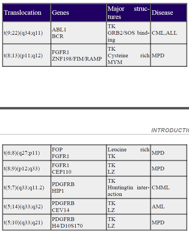 Table 1: Translocations involving tyrosine kinases MPD = myeloproliferative disease Dash, A., Gilliland, D. G. (2001) Molecular genetics of acute myeloid leukaemia. Best Pract Res Clin Haematol 14, 49-64. |