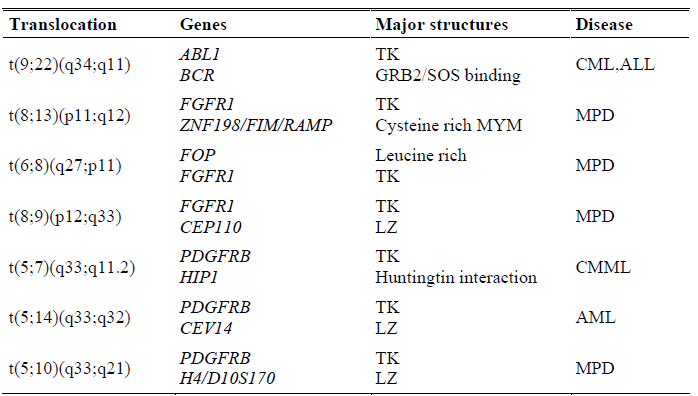 | There are at least seven different chromosomal translocations associated with a myeloproliferative disease. These include the BCR/ABL, ETV6/ABL, ETV6/PDGFRB, HIP1/PDGFRB, H4/PDGFRB, RAB5E/PDGFRB, and ETV6/JAK2 fusions (table 1) (Dash and Gilliland, 2001).