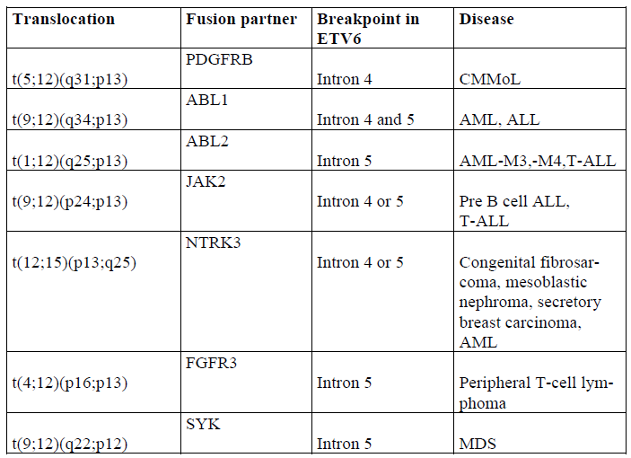 | [The fusion protein critical for the development of the chronic myelo-]monocytic leukemia is the ETV6/PDGFRB fusion and not the reciprocal PDGFRB/ETV6 fusion. In the ETV6/PDGFRB fusion protein the N terminal portion of ETV6, which includes the pointed domain, is fused to the C-terminal two thirds of the PDGFRB protein, conserving the tyrosine kinase domain of PDGFRB. The fusion of the pointed domain of ETV6 in the N-terminal half with the tyrosine kinase domain in the C-terminal half of the fusion partner is characteristic of the class of ETV6/PTK fusions and is found in the fusions of ETV6 with ABL1, ABL2, JAK2, NTRK3, FGFR3 and SYK (Fig. 11) (Table 2) (Papadopoulos et. al., 1995; Cazzaniga et. al., 1999; Knezevich et. al., 1998; Kuno et. al., 2001; Peeters et. al., 1997)