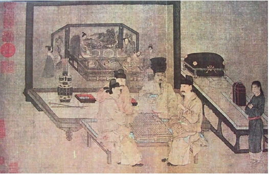 Abb.3: Zhou Wenju (war tätig zwischen 907 – 960): Chongping Huiqi Tujuan (Bildrolle von Schachspiel vor einem Doppelwandschirm) In: Wörterbuch der chinesischen bildenden Kunst, Shanghai 1987, Taf. 4 Die „Bildrolle Schachspiel vor einem Doppelwandschirm 重屏會棋圖卷 “ (Abb. 1), die während der Fünf Dynastien (907 – 960) vom Maler Zhou Wenju 周文矩 perspektivisch gemalt wurde, ist ein Beispiel dieser Bildgattung. Im Bild sitzen vier Männer um einen Tisch und spielen Schach. Ein Diener steht neben ihnen. Hinter ihnen steht ein Schreibtisch und ein gemalter Wandschirm. Im gemalten Wandschirm wird ein weiterer Raum dargestellt, in dem ein Mann und vier Frauen zu sehen sind. Hinter dem Mann und den vier Frauen, die im gemalten Wandschirm dargestellt werden, steht ein weiterer dreiteiliger Wandschirm mit zwei Flügeln. Auf dem dreiteiligen Wandschirm sind Landschaftsbilder zu sehen. Die Raumvorstellung wird durch den doppelt [dargestellten Wandschirm vertieft:] |