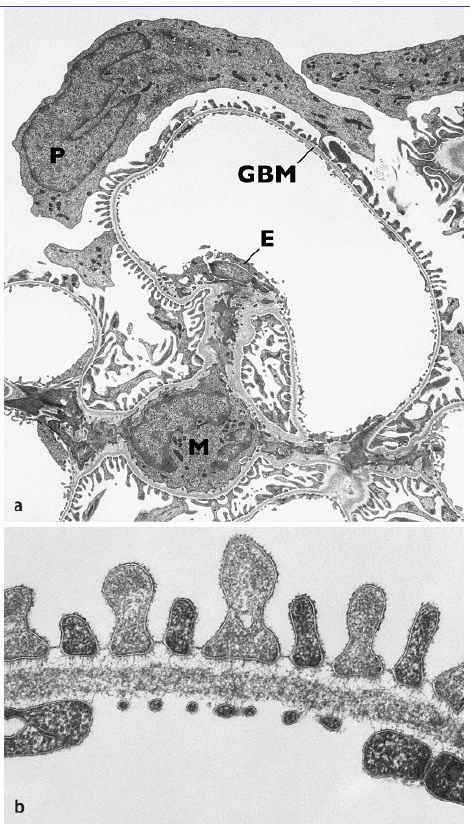 Abb. 1.3: Transmissionselektronenmikroskopische Bilder. a) Glomeruluskapillare mit Mesangium (M), GBM, Porenendothel (E) und Podozytenschicht (P). Beachte, dass der Zellkörper des Podozyten nicht direkt auf der GBM aufsitzt, sondern sozusagen an seinen Fortsätzen hängend im Harnraum flottiert und b) Detailbild der Filtrationsbarriere bestehend aus dem Endothel mit offenen Poren, der GBM mit Lamina rara interna, Lamina densa und Lamina rara externa und der zwischen den Podozytenfüßchen ausgespannten Schlitzmembran. (Foto: Hiltraud Hosser, Institut für Anatomie und Zellbiologie der Universität Heidelberg) [Dadurch wird einerseits eine mechanisch stabile und möglicherweise dynamische Verbindung zwischen GBM und Zytoskelett der Podozyten geschaffen,] andererseits ermöglichen diese Verbindungen ein „inside-out-“ und ein „outside-in-signalling“ und damit auch die Übertragung von mechanischen Signalen aus der GBM in die Fußfortsätze (Pavenstädt et al., 2003). Zwischen den Fußfortsätzen bleiben mäandrierende Spalten offen, die sog. Filtrationsschlitze. Sie haben eine Tiefe von 300-500 nm und eine Breite von 30-40 nm. Diese Schlitze werden in der Tiefe von der ungefähr 4 nm dicken Schlitzmembran überbrückt (Abb. 1.3b, 1.4). Dies ist eine extrazelluläre Proteinstruktur mit einem außerordentlich regelmäßigen submikroskopischen Aufbau. Die Schlitzmembran ähnelt ultrastrukturell einer Adherensverbindung. An ihrem Aufbau sind die Proteine Nephrin, Neph1, 2 und 3, PCadherin und FAT beteiligt. Dies sind transmembranäre Proteine mit langen extrazellulären Domänen, von denen man annimmt, dass sie aus gegenüberliegenden Fußfortsätzen aufeinander zulaufen, sich überlappen und einander binden und dabei eine spezifische Porenstruktur die Schlitzmembran ausbilden. Der Aufbau der Schlitzmembran ähnelt einer Zonula adherens aus sich in der Mitte überlappenden, transmembranären Proteinen; dazu gehören bis zum heutigen Kenntnisstand die Proteine Nephrin, Podocin, CD2AP, ZO-1, Neph1-3, P-Cadherin, Densin-180 und FAT1/FAT2 (Ahola et al., 2003; Donoviel et al., 2001; Huber & Benzing, 2005; Ihalmo et al., 2003; Inoue et al., 2001; Kim et al., 2003; Reiser et al., 2000; Roselli et al., 2002; Sellin et al., 2002; Shih et al., 1999). |