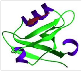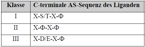 Abb. 1.9: Dreidimensionale schematische Darstellung einer PDZ-Domäne (http://pawsonlab.mshri.on.ca/). 1.3 Das Protein PATJ Die ursprünglich entdeckte Proteinsequenz der murinen Variante von PATJ, CIPP (channel interacting PDZ domain protein), (Kurschner et al., 1998), beinhaltet vier so genannte PDZ-Domänen. Inzwischen ist bekannt, dass es sich bei der von Kurschner et al. 1998 gefundenen Sequenz um eine Verkürzungsmutante handelt und CIPP wie PATJ zehn PDZ-Domänen beinhaltet. PDZ-Domänen (DHRs, discs-large homology regions; GLGF repeats, Gly-Leu-Gly-Phe) sind Protein-Protein-Interaktionsmodule, die in der Sequenz von Gerüstproteinen vermehrt anzutreffen sind. Der Name dieser ca. 90 Aminosäuren langen Module leitet sich von Mitgliedern der MAGUK-Proteinfamilie ab, in denen sie erstmals beschrieben wurden: PSD-95 (postsynaptic density 95)/DLG (discs-large)/ZO- 1 (Ponting, 1997; Saras & Heldin, 1996). Die meisten der bisher bekannten Bindungsmotive von PDZ-Domänen bestehen aus den letzten vier C-terminalen Aminosäuren des Interaktionspartners, wobei Aminosäurereste bis hin zu Position -8 die Bindung beeinflussen können (Hung & Cheng, 2002; Kozlov et al., 2000; Niethammer et al., 1998; Songyang et al., 1997). Inzwischen sind auch interne Bindungsmotive von PDZ-Domänen bekannt (Penkert et al., 2004). Aufgrund der unterschiedlichen Bindungsspezifität wurden PDZ-Domänen in drei Gruppen klassifiziert (Vgl. Tab. 1.3) (Hung & Cheng, 2002). Tab. 1.3: Klassifizierung der PDZ-Domänen anhand der Konsensusbindungssequenz. AS: Aminosäure, X: unspezifische AS, Ф: hydrophobe AS (V, L, I) |