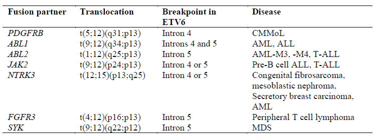 Table2. Tyrosine kinase fusion partners of ETV6 1.6.4 Transcription factors and other fusion partners of ETV6 The ETV6/RUNX1 (ETV6/AML1) fusion is the most common fusion gene in childhood acute B cell lymphoblastic leukemia (Shurtleff et. al., 1995). Cazzaniga, G., Tosi, S., Aloisi, A., Giudici, G., Daniotti, M., Pioltelli, P., Kearney, L., and Biondi, A. (1999). The tyrosine kinase abl-related gene ARG is fused to ETV6 in an AML-M4Eo patient with a t(1;12)(q25;p13): molecular cloning of both reciprocal transcripts. Blood 94, 4370- 4373. Knezevich, S. R., McFadden, D. E., Tao, W., Lim, J. F., and Sorensen, P. H. (1998). A novel ETV6-NTRK3 gene fusion in congenital fibrosarcoma. Nat Genet 18, 184-187. Kuno, Y., Abe, A., Emi, N., Iida, M., Yokozawa, T., Towatari, M., Tanimoto, M., and Saito, H. (2001). Constitutive kinase activation of the TEL-Syk fusion gene in myelodysplastic syndrome with t(9;12)(q22;p12). Blood 97, 1050-1055. Papadopoulos, P., Ridge, S. A., Boucher, C. A., Stocking, C., and Wiedemann, L. M. (1995). The novel activation of ABL by fusion to an ets-related gene, TEL. Cancer Res 55, 34-38. Peeters, P., Raynaud, S. D., Cools, J., Wlodarska, I., Grosgeorge, J., Philip, P., Monpoux, F., Van Rompaey, L., Baens, M., Van den Berghe, H., and Marynen, P. (1997a). Fusion of TEL, the ETS-variant gene 6 (ETV6), to the receptor-associated kinase JAK2 as a result of t(9;12) in a lymphoid and t(9;15;12) in a myeloid leukemia. Blood 90, 2535- 2540. Peeters, P., Wlodarska, I., Baens, M., Criel, A., Selleslag, D., Hagemeijer, A., Van den Berghe, H., and Marynen, P. (1997b). Fusion of ETV6 to MDS1/EVI1 as a result of t(3;12)(q26;p13) in myeloproliferative disorders. Cancer Res 57, 564-569. Shurtleff, S. A., Buijs, A., Behm, F. G., Rubnitz, J. E., Raimondi, S. C., Hancock, M. L., Chan, G. C., Pui, C. H., Grosveld, G., and Downing, J. R. (1995). TEL/AML1 fusion resulting from a cryptic t(12;21) is the most common genetic lesion in pediatric ALL and defines a subgroup of patients with an excellent prognosis. Leukemia 9, 1985-1989. |